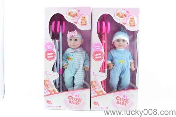 女孩13寸12声IC多功能喝水撒尿娃(配吸水奶瓶,纸尿裤,尿盆,餐纸盒,多功能摇篮,铁车) |