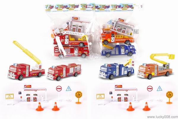 惯性实色镀座消防车2只装2款混装(配加油站,6个路标) |